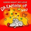 A cute cartoon mouse with a red nose dreams of you, wishing a good night with floating hearts.