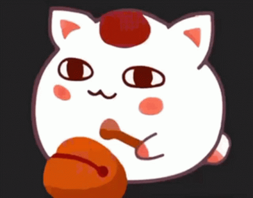 Animated white cat character, Drem from Dragon Raja, playing an orange bell with a stick.
