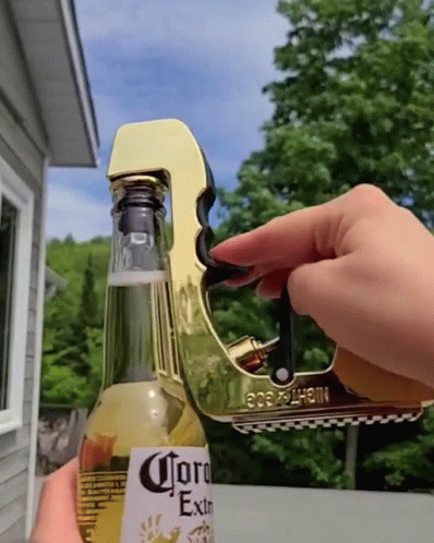 Person uses a unique golden gun-shaped bottle opener to effortlessly pop the cap off a Corona Extra beer bottle.