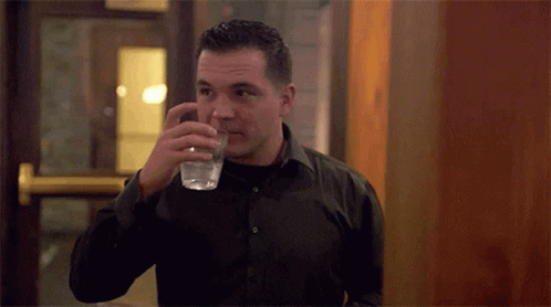 A man from Jersey Shore Family Vacation takes a refreshing sip of water, staying hydrated.