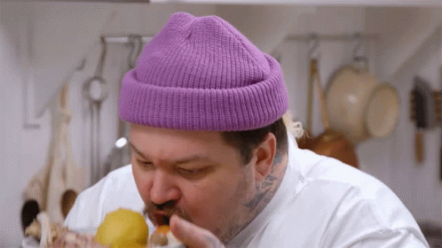 Matty Matheson intently smelling and tasting a dish from a plate, wearing a purple beanie.