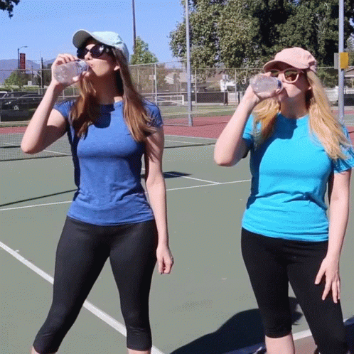 Shanna Lisa and Marissa Rachel drink water on a sunny tennis court, smiling at the camera.