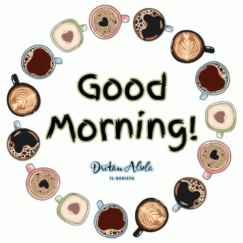 A cheerful 'Good Morning!' message surrounded by various coffee cups, featuring Dritan Alsela's signature.