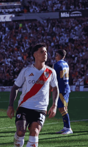 Driussi celebrates a goal for River Plate, humiliating the opponent in a Superclásico match.