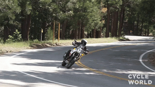 A rider on a Yamaha Ténéré700 motorcycle leans into a curve on a scenic road, featured by Cycle World.