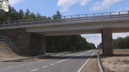 A view of a concrete bridge spanning over a two-lane road, with the title 'Droga Boli Ucho' and a yellow ear icon.