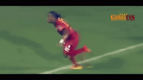 Didier Drogba celebrates a goal on the field, running towards the corner flag in his red Galatasaray jersey.