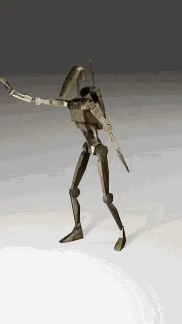 A B1 Battle Droid from Star Wars stands in a red-lit scene, followed by a red spiky mine.