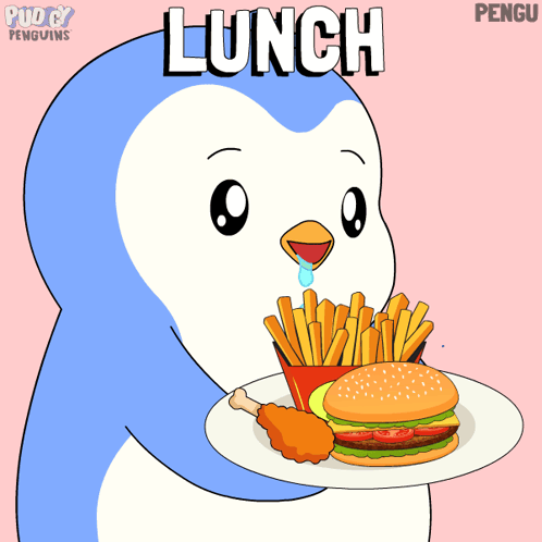 a cartoon of a penguin eating a hamburger and french fries from a plate