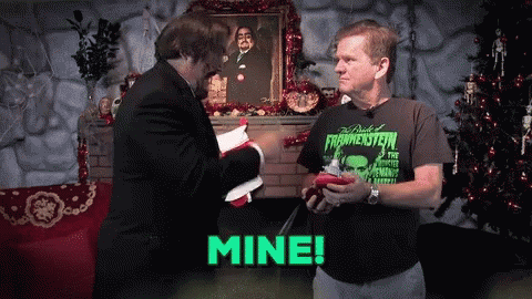 Drpaulbearer attempts to take a gift from Eddiemunster in a festive, spooky setting.