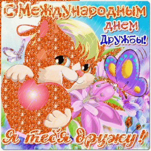 A glittery animated greeting card featuring a cute cat and butterflies, celebrating International Friendship Day.