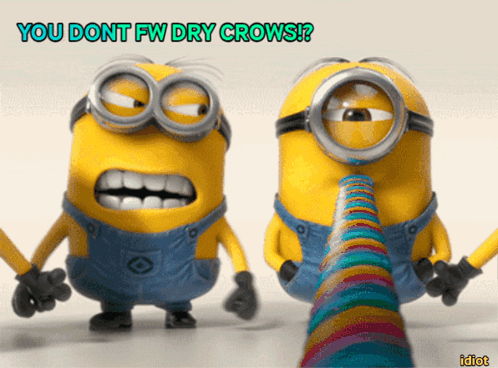 Minions dancing with the caption 'YOU DONT FW DRY CROWS!?' and 'idiot' on screen.