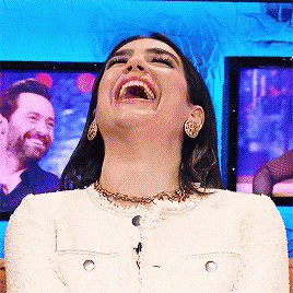 Dua Lipa laughing heartily with her head tilted back, wearing a white jacket and gold necklace.