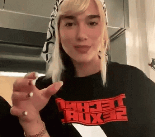 Dua Lipa clapping happily, wearing a black shirt with a red logo and a patterned headband.