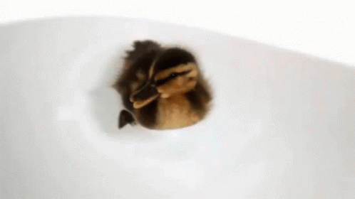 An adorable duckling swims in a white basin, making small ripples in the water.
