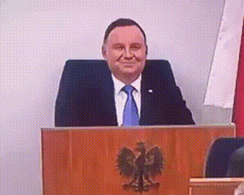 Andrzej Duda, President of Poland, shares a moment of laughter while behind a podium at the Sejm.
