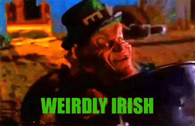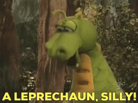 Dudley The Dragon exclaims 'A leprechaun, silly!' in a forest setting.