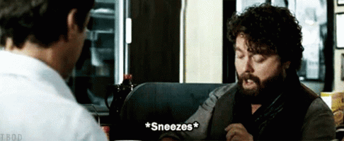 Ethan Chase, played by Zach Galifianakis, sneezes while sitting at a table with another man in the movie Due Date.