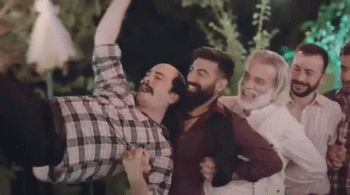 Men celebrate at a Düğün, lifting a man in a plaid shirt during a lively Halay dance.