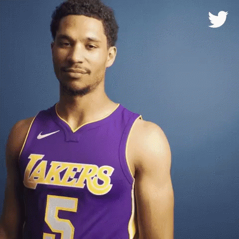 Josh Hart, wearing a Lakers jersey, gestures as the word 'DUH' appears on screen.