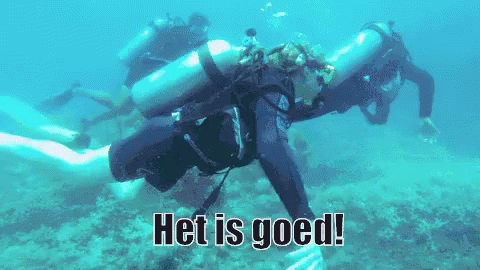 Scuba divers explore the clear blue ocean, with the Dutch caption 'Het is goed!' (It is good!) appearing on screen.