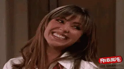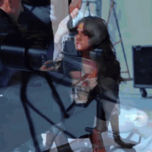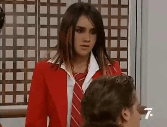 Dulce María smiles brightly while posing in a studio setting, wearing a sparkly jacket and red heels.