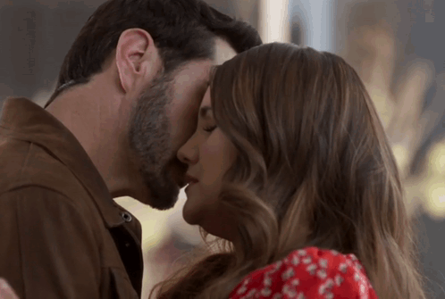 Dulce Maria and David Zepeda share a passionate kiss, embracing closely in a romantic moment.