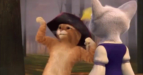 Puss in Boots winks and flexes his arm while standing next to Dulcinea in an animated scene.
