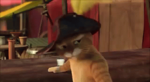 Puss in Boots and Dulcinea face off, with Puss showing a range of emotions from surprise to a smile.
