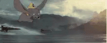 Dumbo the elephant flying like a jet plane over a body of water with mountains in the background.