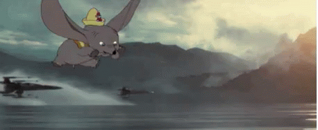 Dumbo the elephant flies alongside Star Wars X-wing fighters over a body of water in an animated scene.