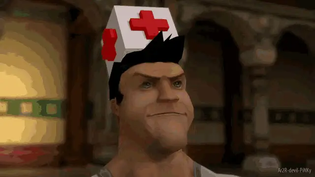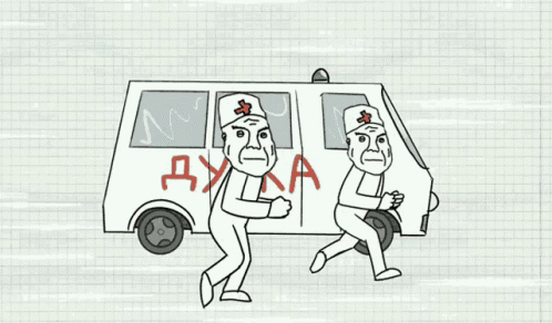 Cartoon doctors in white uniforms push an ambulance with 'ДУРКА' (Durka) written on its side.