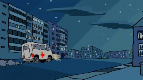 Cartoon animation of a 'Durka' ambulance speeding through a city at night, driven by a doctor.