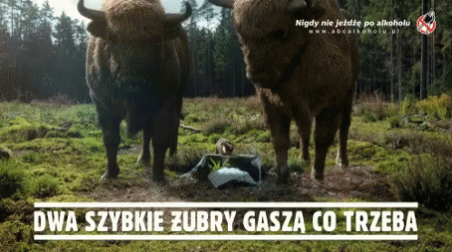 Two bison in a forest clearing, with a Polish anti-drinking and driving message and a pun about quenching thirst.