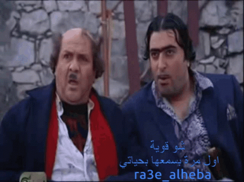 As'ad Kharshouf and another character from the Syrian comedy series Dei'a Daya'a reacting with surprise.