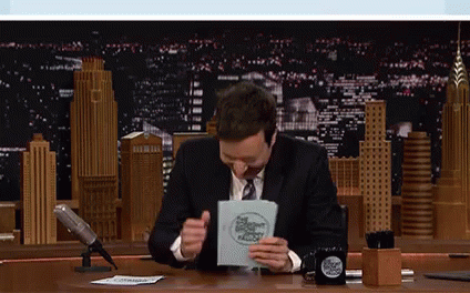 Jimmy Fallon laughing hysterically at his desk, almost falling over during a talk show segment.