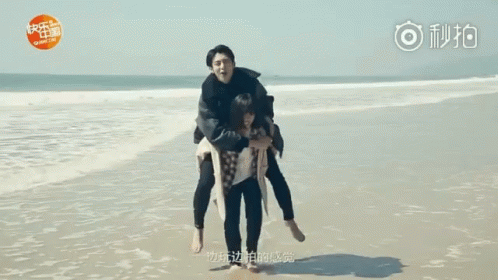 Dylan Wang and Shen Yue (Diyue) share playful moments on the beach, including a piggyback ride and laughter.