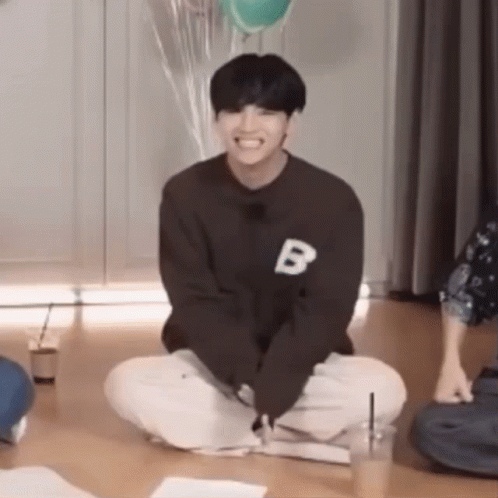 Taehyung from BTS giggling while sitting on the floor in a sweater with a 'B' on it.