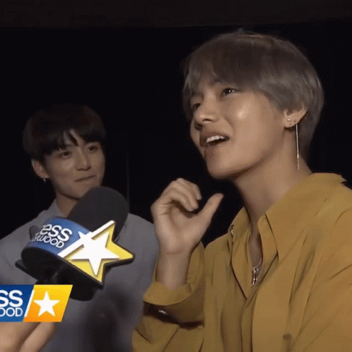 BTS members Taehyung and Jungkook during an interview, with Taehyung smiling and Jungkook in the background.