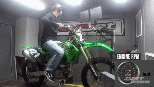 Man on a green 2021 Kawasaki KX250 dirt bike undergoing a dyno test for engine performance.