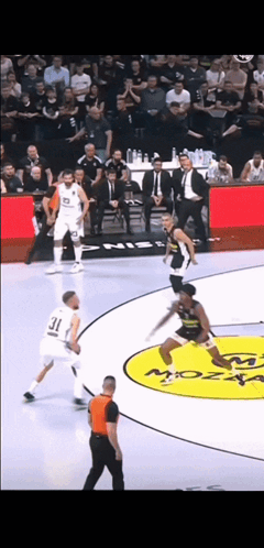 Dzanan Musa of Real Madrid sinks a crucial 3-pointer during a basketball game, showcasing his stepback move.