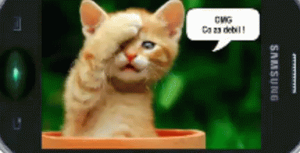 A screen recording of a Samsung phone displaying a popular cat meme with the caption 'OMG Co za debil!' (OMG What an idiot!).