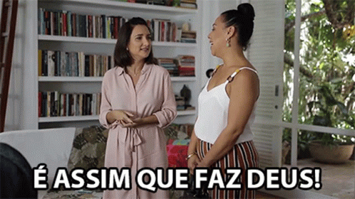 Two women from Porta Dos Fundos, including Evelyn Castro, in a living room with the caption 'É ASSIM QUE FAZ DEUS!'