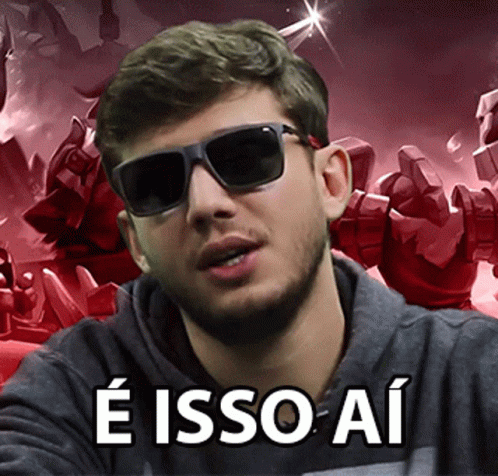A man wearing sunglasses and a beard says 'É Isso Aí' (That's It) in front of a red, possibly gaming-related background.