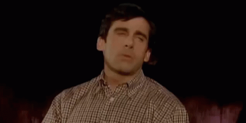 Steve Carell expresses boredom with a 'blah blah blah' gesture, wearing a plaid shirt.