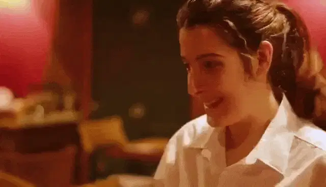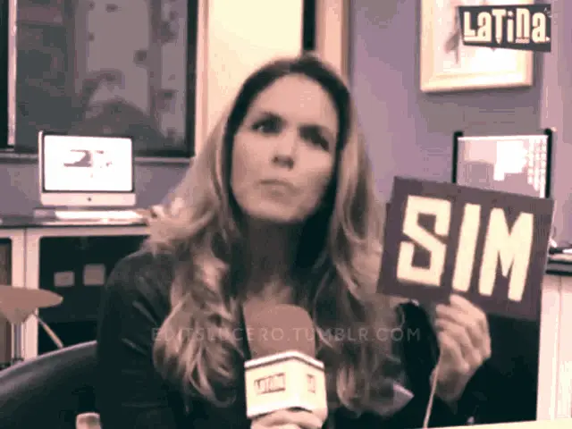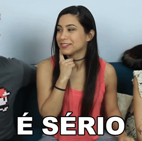 Sandra Landeiro reacts with a thoughtful expression, displaying the text 'É SÉRIO' (Seriously) while sitting on a couch.