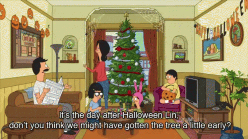 The Belcher family from Bob's Burgers celebrates an early Christmas in November, with a tree alongside Halloween decorations.