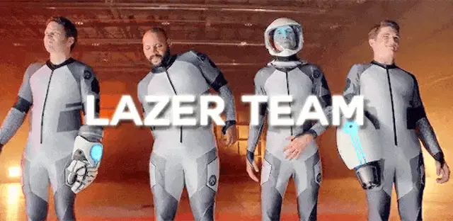a man wearing glasses is clapping in front of a sign that says lazer + splodey lazersplode