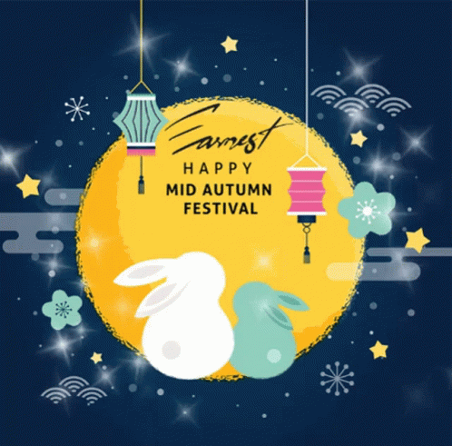 Earnest wishes for a Happy Mid Autumn Festival, featuring two rabbits, lanterns, and a full moon.