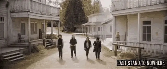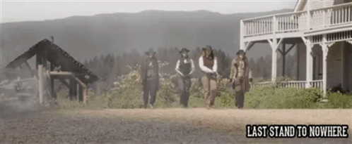 The Earp Sisters and companions walk through a dusty Western town, ready for a showdown.